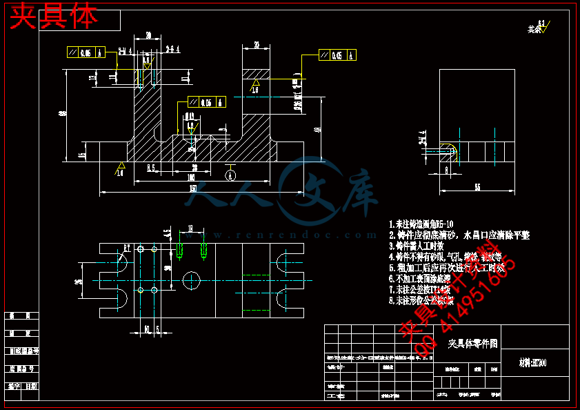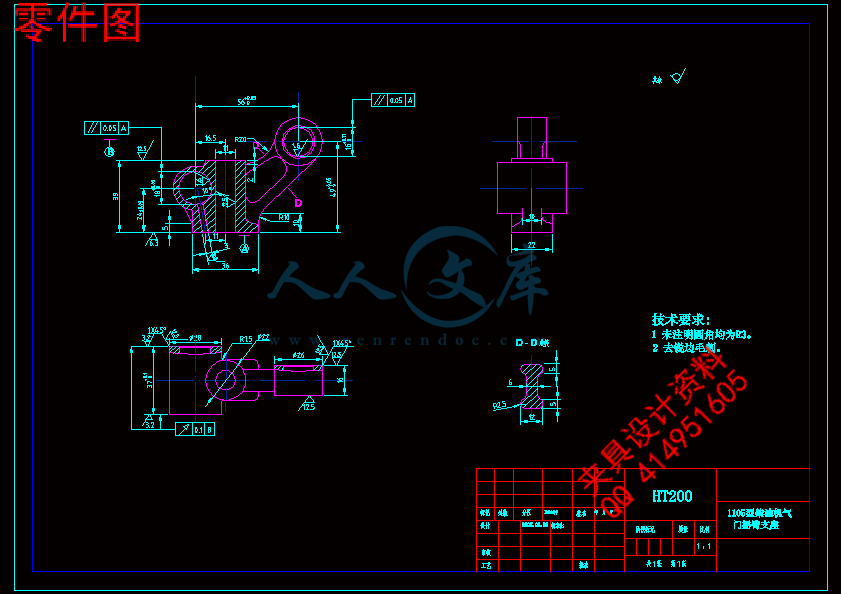 零件的材料为HT200,灰铸铁生产工艺简单,铸造性能优良,但塑性较差、脆性高,为此以下是气门摇臂轴支座需要加工表面以及加工表面的位置要求。现分析如下: